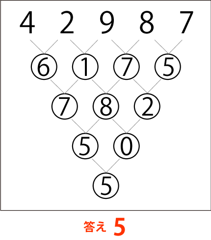 5つの隣同士の数字を足した合計の1桁の数字だけを、更に隣同士で足し算します。それを繰り返し、最後の1桁の数字を答えなさい。