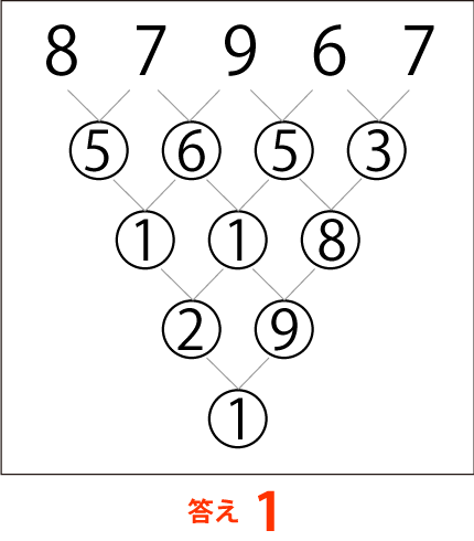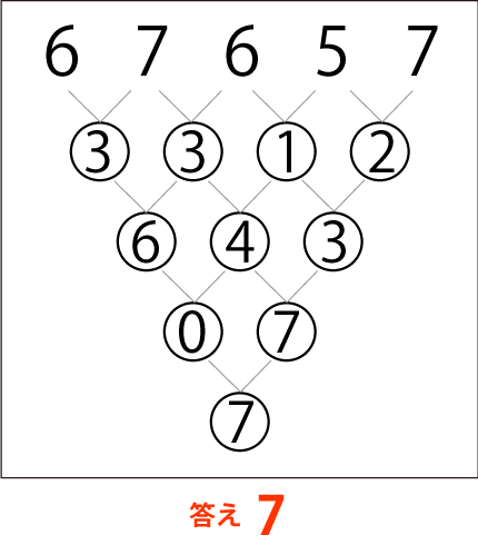隣同士の数字を足した合計の1桁の数字だけを、更に隣同士で足し算します。それを繰り返し、最後の1桁の数字を答えなさい。
