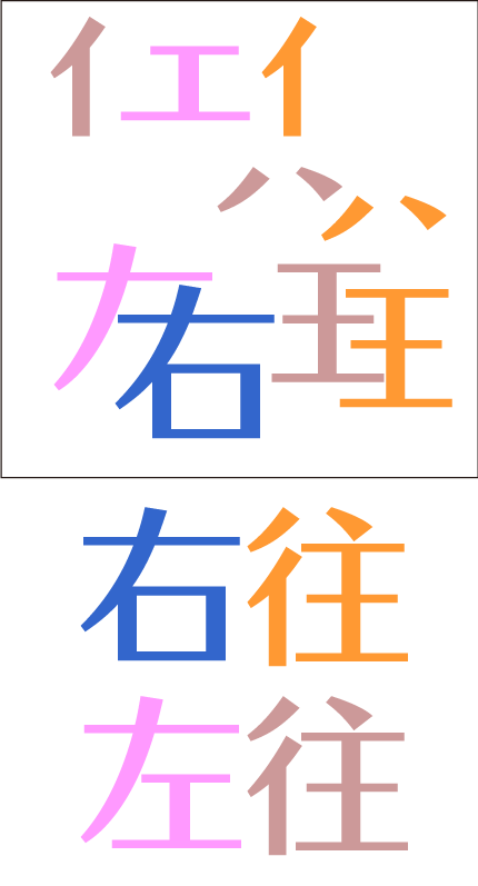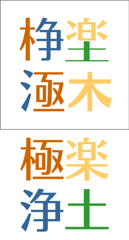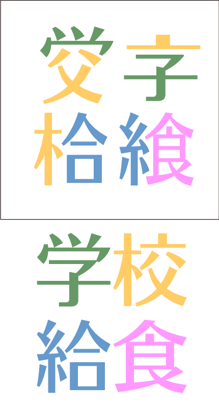 漢字4文字初級問題。4文字の漢字がバラバラに別けられています。パーツを移動して漢字4文字を完成させて下さい。