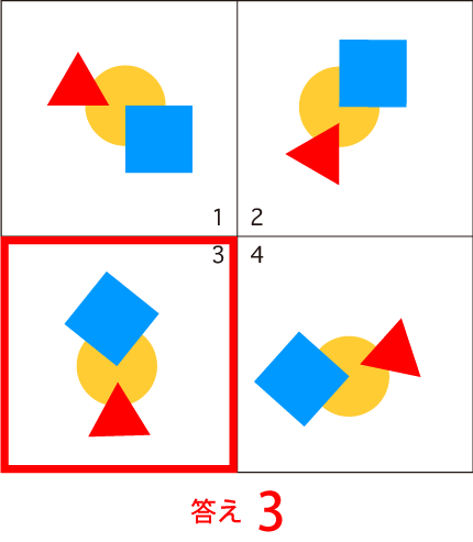 下の4つのイラスト(赤い三角・青い正方形・黄色い丸)の中で、1つだけ他の3つと違う図形があります。その番号を答えなさい。