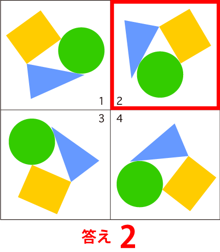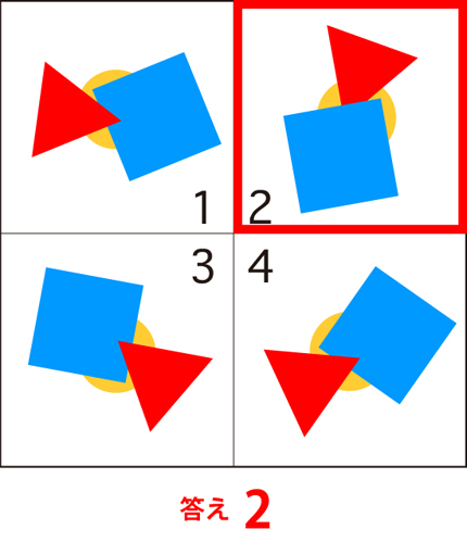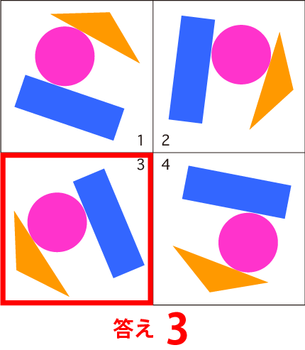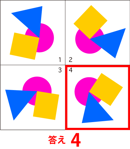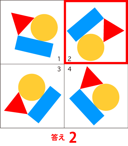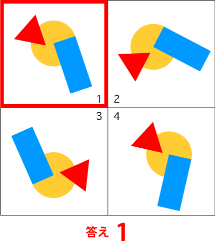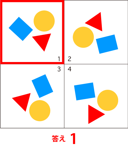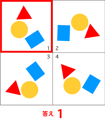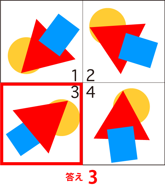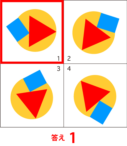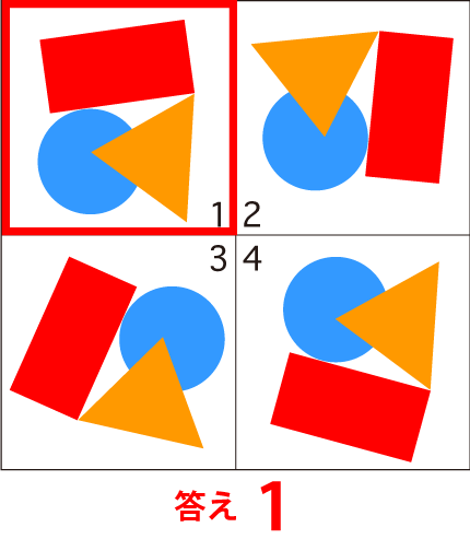 下の1〜4の構成図形(赤色の三角形・黄色の円・水色の長方形)の中で、1つだけ他の3つと違う図形があります。どれか、わかりますか?