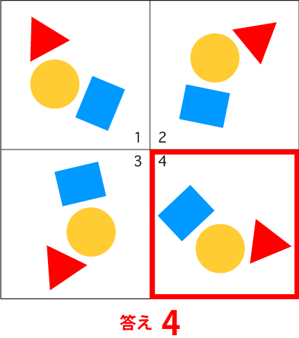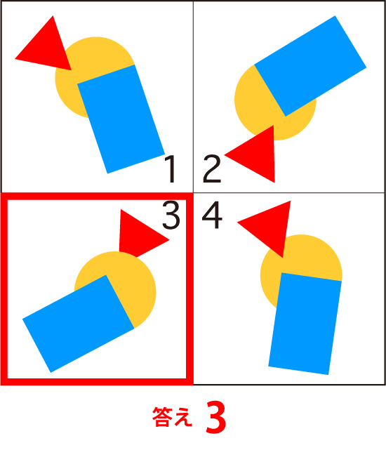 4つの構成図形(黄色の円・赤色の三角形・水色の長方形)の中で、1つだけ他の3つと違う図形があります。その番号を答えなさい。