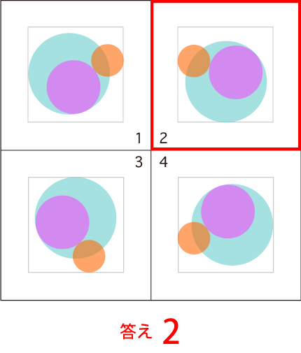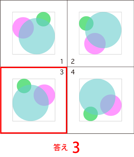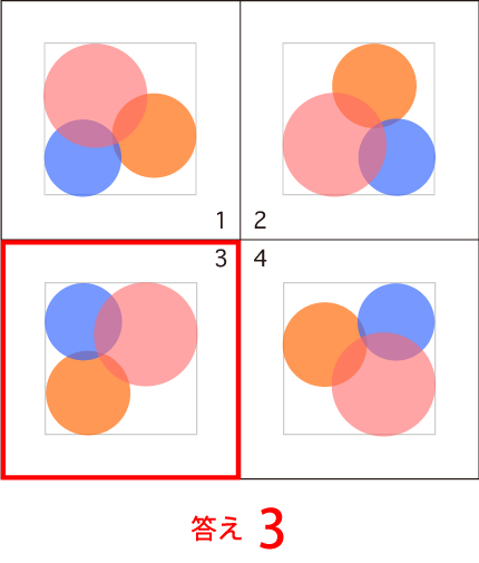 下の4つの構成図形(緑色とピンク色とオレンジ色の円)の中で、3枚と違う図形が1つだけあります。その番号を答えなさい。