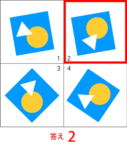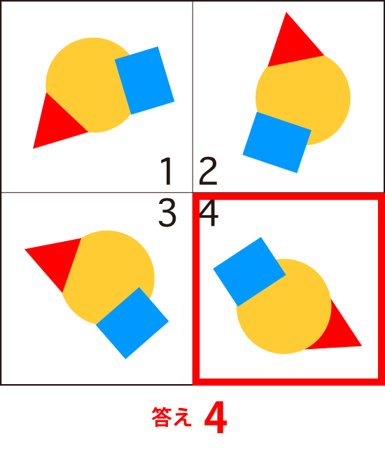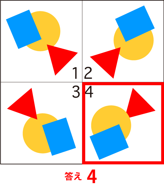 下の4つの構成図形(水色の正方形・黄色の円・白色の三角形)の中で、1つだけ他の3つと違う図形があります。その番号を答えなさい。