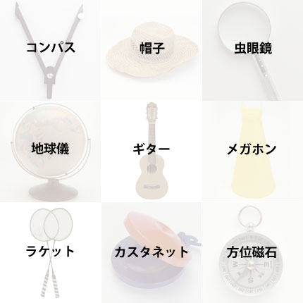 次の9枚の写真(コンパス・地球儀・バドミントンのラケット・ハット・クラッシックギター・カスタネット・虫眼鏡・メガフォン・方位磁石)を20秒のうちに記憶して、2分後に思い出せるすべての名前をメモに書き出しなさい。2分間は、できるだけ別の脳トレをすることをお薦めします。記憶力トレー二ングで認知症予防にも。