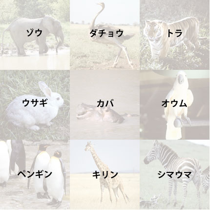 次の9枚の写真(ゾウ・ウサギ・ペンギン・ダチョウ・カバ・キリン・トラ・オウム・シマウマ)を20秒のうちに記憶して、2分後に思い出せるすべての名前をメモに書き出しなさい。2分間は、できるだけ別の脳トレをすることをお薦めします。記憶力トレー二ングで認知症予防にも。