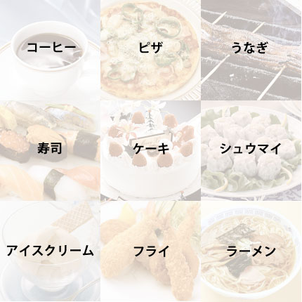 次の9枚の写真(コーヒー・寿司・バニラアイス・ピザ・デコレーションケーキ・エビフライ・ウナギ・シュウマイ・ラーメン)を20秒のうちに記憶して、2分後に思い出せるすべての名前をメモに書き出しなさい。2分間は、できるだけ別の脳トレをすることをお薦めします。