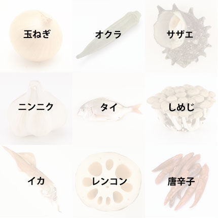 次の9枚の写真(玉ねぎ・ニンニク・イカ・オクラ・鯛・蓮根・サザエ・しめじ・トウガラシ)を20秒のうちに記憶して、2分後に思い出せるすべての名前をメモに書き出しなさい。2分間は、できるだけ別の脳トレをすることをお薦めします。