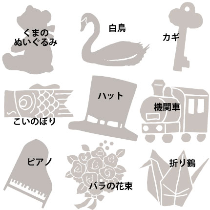 次の9枚のイラスト(くまのぬいぐるみ・こいのぼり・ピアノ・白鳥・シルクハット・バラの花束・カギ・機関車・オリヅル)を20秒のうちに記憶して、2分後に思い出せるすべての名前をメモに書き出しなさい。2分間は、できるだけ別の脳トレをすることをお薦めします。