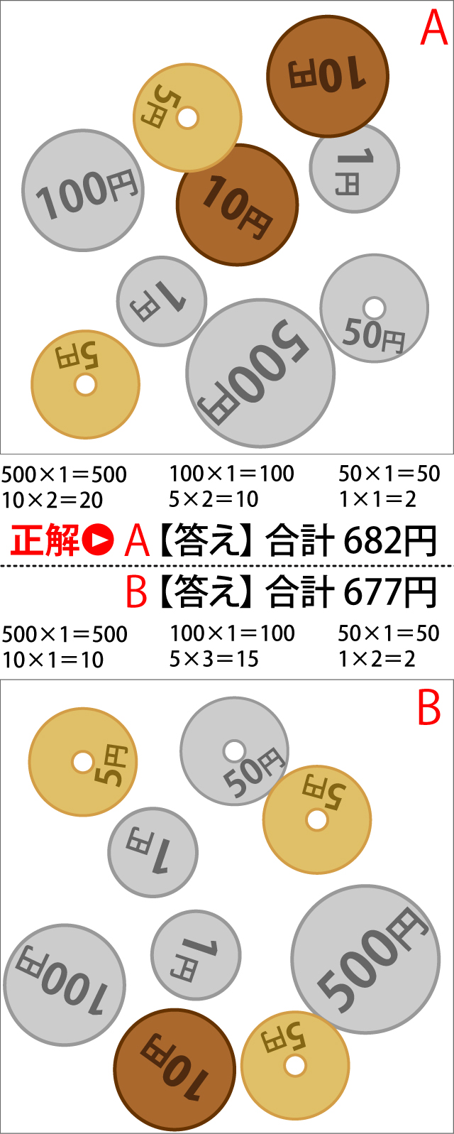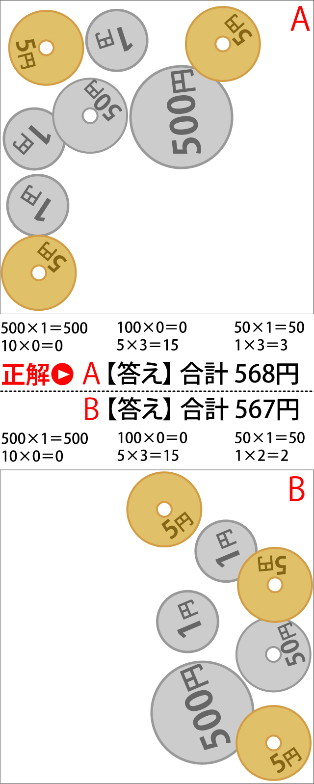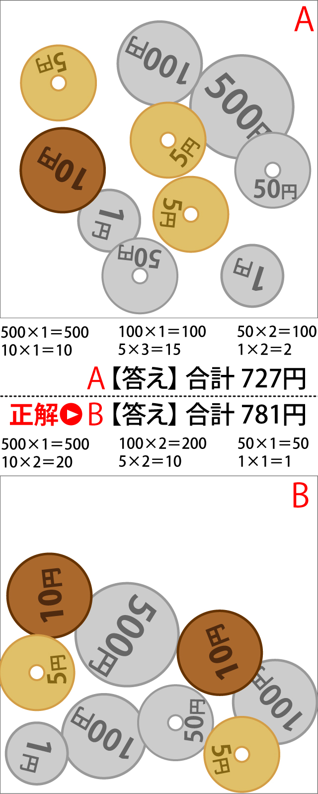 500円硬貨、100円硬貨、50円硬貨、10円硬貨、5円硬貨、1円硬貨のイラストがあります。AとBそれぞれ暗算で足すと、どちらの方が多いでしょうか?